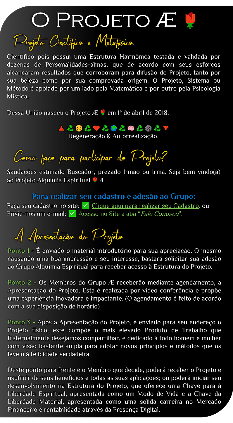 Alquimia Espiritual é um Projeto Científico e Metafísico. Científico pois possui uma Estrutura Harmônica testada e validada por dezenas de Personalidades-almas, que de acordo com seus esforços alcançaram resultados que corroboram para difusão do Projeto, tanto por sua beleza como por sua comprovada origem. O Projeto, Sistema ou Método é apoiado por um lado pela Matemática e por outro pela Psicologia Mística. Dessa União nasceu o Projeto Æ 🌹 em 1º de abril de 2018.